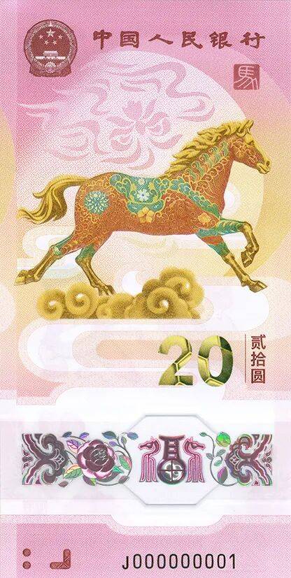 纪念钞正面主景为马的造型图案,上方为中华人民共和国国徽、“中国人民银行”、篆书“马”字印章,下方依次为光彩光变面额数字“20”与汉字“贰拾圆”、动感全息图案、透明视窗、盲文面额标记和冠字号码,跟以往保持一致风格。