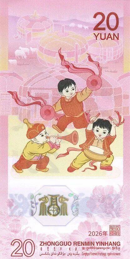 纪念钞背面主景为儿童欢庆锣鼓图案,辅以蒙古包装饰图案,上方为面额数字“20”、汉语拼音字母“YUAN”,下方为花卉与动感全息图案、年号“2026年”、行长章、面额数字“20”、“中国人民银行”汉语拼音和蒙、藏、维、壮四种民族文字的“中国人民银行贰拾圆”字样。