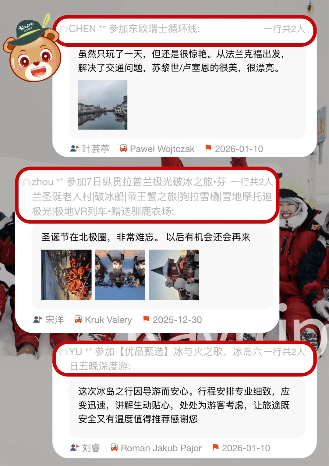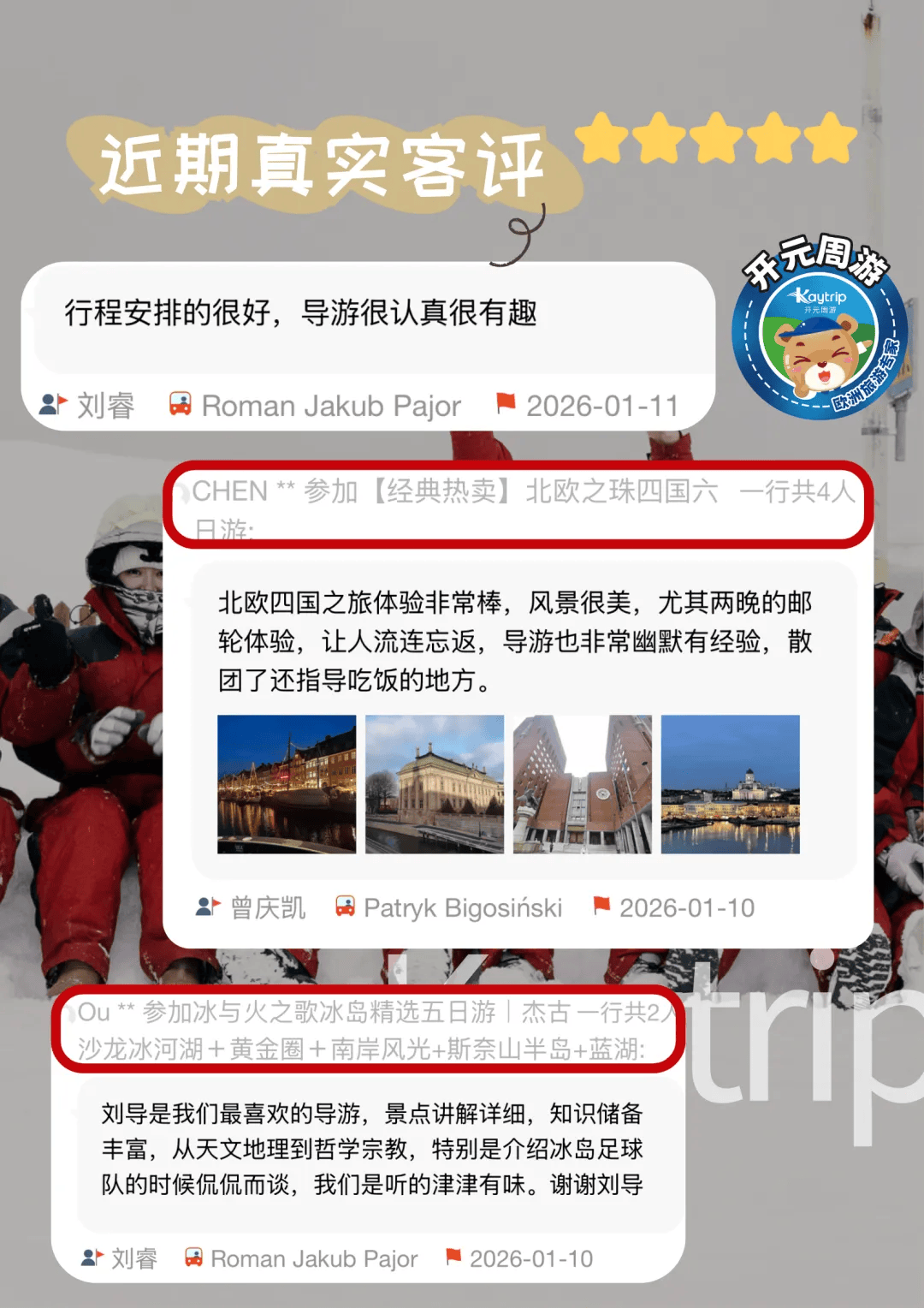 :“行程安排专业细致,导游讲解生动贴心,从天文地理到哲学宗教都能侃侃而谈,因导游而格外安心”“蓝湖温泉太治愈,极光肉眼可见,这趟旅行值了”。
