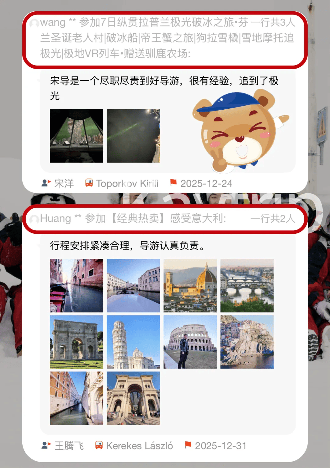 :“行程安排紧凑合理,导游认真负责,每座城市都有独特魅力,佛罗伦萨的艺术氛围让人沉醉”“威尼斯水城的冬季人少景美,拍照超出片”。