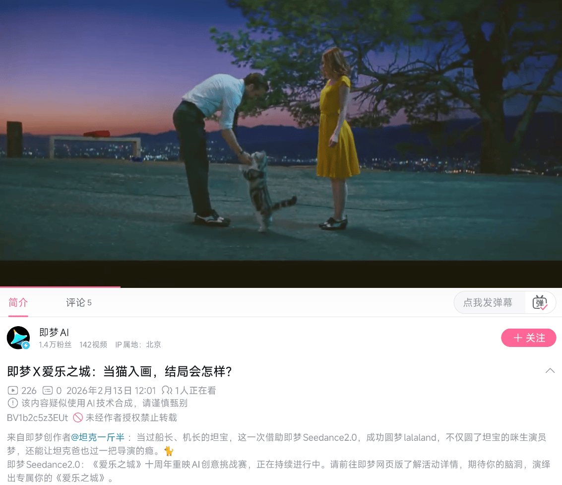 北京航空航天大学人工智能研究院教授沙磊对此评价说,现在Seedance2.0还在小范围内测阶段,字节也限制了一部分模型功能,比如只有在进行活体认证的情况下可以生成真人视频,不支持输入真人图片或视频做主体参考等,以防止AI技术被滥用,“这种尝试是企业在技术狂奔时要守住的责任底线日中午,贝壳财经记者注意到,即梦AI在官方B站账号上上传了3条爱乐之城主题的AI生成视频,视频的最后明确标明“素材由官方合作授权”。这或许是一次积极尝试。