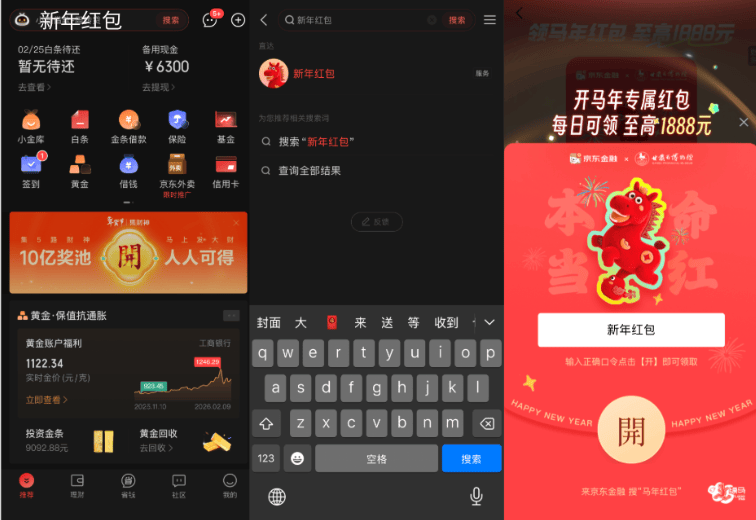 嫌猜数字麻烦,想随手薅羊毛,马年口令红包绝对是懒人福音!京东金融联合甘肃省博物馆打造的马年专属口令红包,操作简单到极致,不用拼手速、不用做任务,只要输对口令,红包福利秒到账,最高可领 1888 元现金,还有黄金赠金、支付券、外卖券等超多福利,吃饭、付款都能用,实打实的日常刚需!